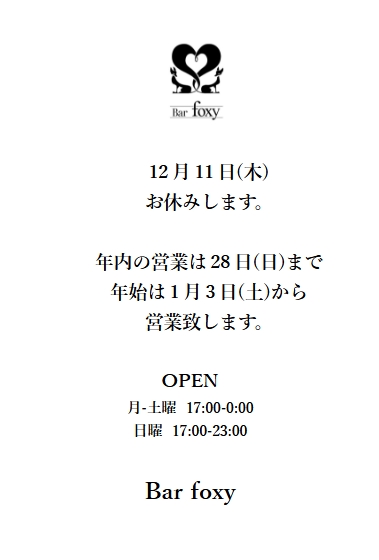 HOME > お知らせ > お知らせ 12月, 年末年始のお知らせ 投稿日:2025年12月1日 12月は11日(木)お休み。 年内は28日(日)まで 年始は1月3日(土)から営業致します。 Twitter Share Pocket Hatena LINE コピーする -お知らせ -2025, 2026